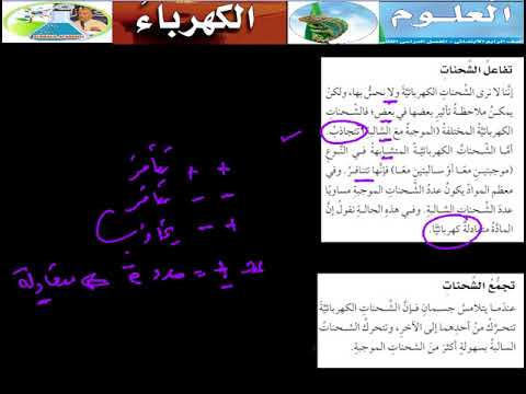 ما الشحنة الكهربائية؟ أقرأ وأتعلم عندما نسمع صوت المؤذن ينادي للصَّلاةِ، أو نتابع برامجنا السؤال الأساسي كيف تؤثر الكهرباء في حياتنا؟ المفردات الكهرباء الساكنة التفريغ الكهربائي التيار الكهربائي الدائرة الكهربائية المقاومة دائرة التوالي دائرة التوازي مهارة القراءة الاستنتاج التلفزيونية المفضّلة، أو نستمتع بالقراءة تحت ضوء المصباح فإننا نُدرك أثر الكهرباء في حياتِنَا. تتولد الكهرباء نتيجةَ الشَّحنات الكهربائية. والشحنات الكهربائية صغيرة جدا لا يمكن رؤيتها أو شمها أو قياس وزنها، ولكن هذه الشحنات من خصائص المادة، شأنها في ذلك شأن القساوة واللون وغيرهما. الجسيمات الموجبة والجسيمات السالبة من المعلوم أنَّ الذَّرَّةَ أصغر جزء في المادة. وهي تحتوي على ماتٍ صغيرة جدًّا، بعضُها يحمل السحنة الموجبة، ويرمز إليها بالرَّمز (+) . وبعضُها الآخر يحمل الشحنة السالبة، ويرمز أدلة من النص استنتاجات إليها بالرمز (-) البالون وقطعة الصوف متعادلان أي أن كلا منهما له عدد شحنات موجبة (1) مساوية للشحنات السالبة (-) الشحنة الكلية الشحنات السالبة للبالون تتجاذب مع الشحنات الموجبة للجدار، فيلتصق البالون بالجدار. عند ذلك البالون بقطعة الصوف تتراكم عليه شحنات سالبة (-) الشرح والتفسير liaرت التغلط