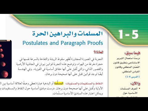 المسلمات والبراهين الحرة Postulates and Paragraph Proofs 1-5 رابط الدر www.ien.edu.sa فيما سبق الماذا؟ درست استعمال التبرير التجربة في الصورة المجاورة تُظهر سقوط الريشة والتفاحة بالسرعة نفسها في الاستنتاجي بتطبيق قانون حجرة مفرغة من الهواء، وتوضح هذه التجربة قوانين نيوتن في الجاذبية الأرضية الفصل المنطقي وقانون والقصور الذاتي، والتي تُقبل على أنها حقائق أساسية في الفيزياء. وفي الهندسة أيضًا توجد قوانين تقبل على أنها صحيحة دون برهان. القياس المنطقي. ( الدرس 4-1) والآن: أتعرف المسلّمات الأساسية حول النقاط والمستقيمات والمستويات وأستعملها. أكتب برهانا حرا. المفردات: المسلمة axiom or postulate البرهان proof النظرية theorem البرهان الحر paragraph proof قراءة الرياضيات النقاط والمستقيمات والمستويات المسلمة أو البدهية عبارة تعطي وصفًا لعلاقة أساسية بين المفاهيم الهندسية الأولية وتُقبل على أنها صحيحة دون برهان درست مبادئ أساسية حول النقاط والمستقيمات والمستويات، ويمكن اعتبار هذه المبادئ الأساسية مسلّمات. مسلمات التعبير اللفظي 1.1 أي نقطتين يمر بهما مستقيم واحد فقط. 1.2 أي ثلاث نقاط لا تقع على استقامة واحدة يمر بها مستوى واحد فقط. 1.3 كل مستقيم يحوي نقطتين على الأقل. 1.4 كل مستوى يحوي ثلاث نقاط على الأقل ليست على استقامة واحدة. 1.5 إذا وقعت نقطتان في مستوى، فإن المستقيم الوحيد المار بهما يقع كليًّا في ذلك المستوى. النقاط والمستقيمات والمستويات مثال n K R P B A C R P n B K L C E B K A m .R, أضف إلى مطويتك المستقيم n هو المستقيم الوحيد المار بالنقطتين P و R . المستوى X هو المستوى الوحيد الذي يحوي النقاط A و B و C ، والتي لا تقع على استقامة واحدة. المستقيم n يحوي النقاط P و Q يحوي المستوى النقاط L و B و و C و E ، وهي ليست على استقامة واحدة. النقطتان A و B في المستوى ، ويمر بهما المستقيم m ؛ إذن المستقيم m يقع كليا في المستوى و .K يرمز للمستقيم بحرف تتعلق المسلّمات الآتية بتقاطع المستقيمات والمستويات. صغير مائل مثل: ...,,, أو بأي نقطتين واقعتين عليه مثل : .. ,AB, AC يرمز للمستوى بحرف كبير مائل مثل: ... , أو بأي ثلاث نقاط فيه ليست على استقامة واحدة XYZ مسلمتان التعبير اللفظي تقاطع المستقيمات والمستويات 1.6 إذا تقاطع مستقيمان، فإنهما يتقاطعان في نقطة واحدة فقط. 1.7 إذا تقاطع مستويان، فإن تقاطعهما يكون مستقيما. S P G لله F مثال أضف إلى مطويتك المستقيمان ، و t يتقاطعان في النقطة P يتقاطع المستويان 7 و 6 في المستقيم الدرس 5-1 - المسلمات والبراهين الحرة التP45 Ministry of Education 2024-1446