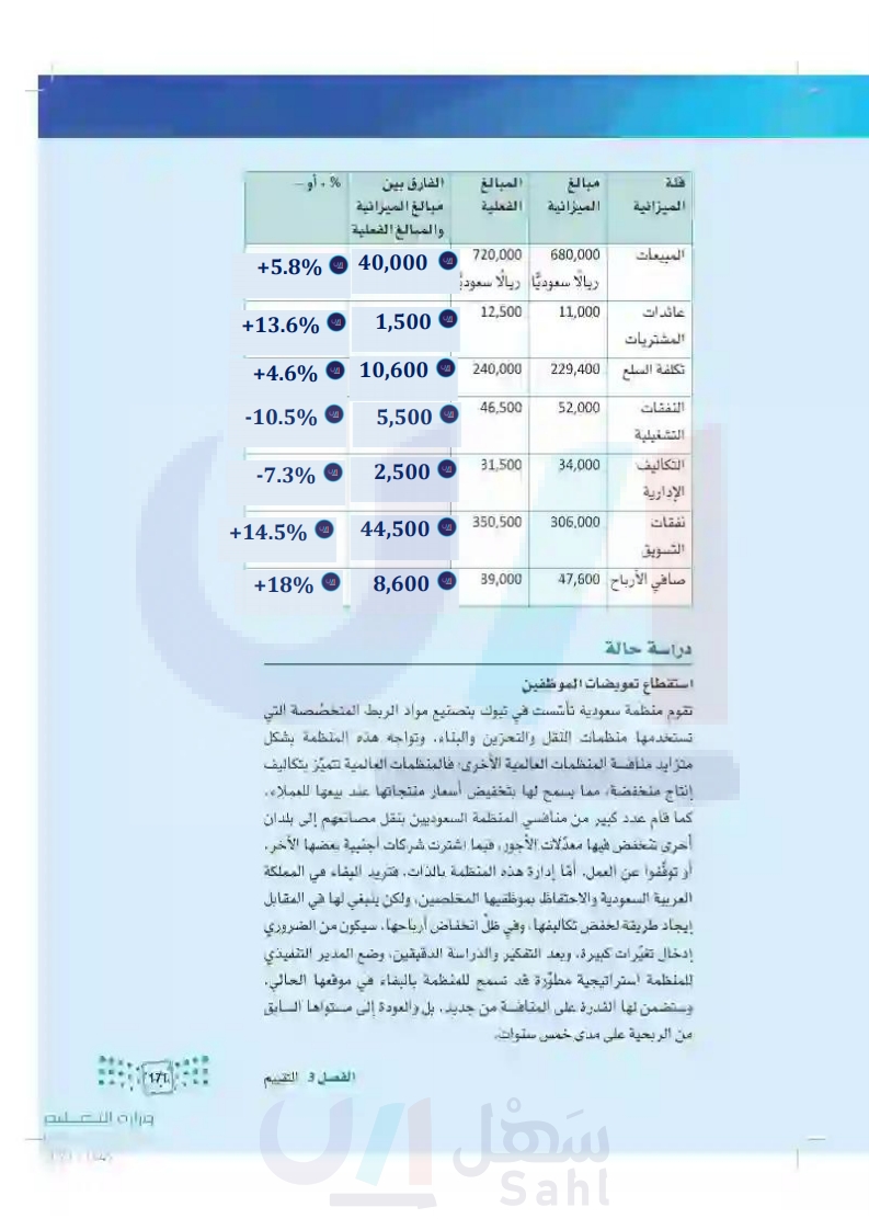 مبالغ المبالغ الفارق بين الميزانية الميزانية الفعلية مبالغ الميزانية والمبالغ الفعلية المبيعات 680,000 720,000 ريالا سعوديا ديالا سعوديا عائدات 11,000 12,500 المشتريات تكلفة السلع النفقات 240,000 229,400 46,500 52,000 التشغيلية التكاليف 31,500 34,000 الإدارية نفقات 350,500 306.000 التسويق صافي الأرباح 47,600 39,000 دراسة حالة 91+% استقطاع تعويضات الموظفين منظمة تقوم سعودية ناتست . في تبوك بتصنيع مواد الربط المتخصصة التي تستخدمها منظمات النقل والتحزين والبناء وتواجه هذه المنظمة بشكل متزايد منافة المنظمات العالمية الأخرى فالمنظمات العالمية تتميز بتكاليف إنتاج منخفضة، مما يسمح لها بتخفيض أسعار منتجاتها عند بيعها للعملاء. كما قام عدد كبير من منافسي المنظمة السعوديين بنقل مصانعهم إلى بلدان أخرى تخفض فيها معدلات الأجور، فيما اشترت شركات اجنبية بعضها الآخر. أو توقفوا عن العمل. أما إدارة هذه المنظمة بالذات. تريد البضاء . المملكة في العربية السعودية والاحتفاظ بموظفيها المخلصين، ولكن ينبغي لها في المقابل إيجاد طريقة لحفص تكاليفها، وفي ظل انخفاض أرباحها، سيكون من الضروري إدخال تغيرات كبيرة. وبعد التفكير والدراسة الدقيقين وضع المدير التنفيذي للمنظمة استراتيجية مطوّرة قد تسمح للمنظمة بالبقاء في موقعها الحالي. وستضمن لها القدرة على المقافة من جديد بل والعودة إلى مستواها السابق من الربحية على مدى خمس سنوات. الفصل 3 التقييم جرارة التعليم